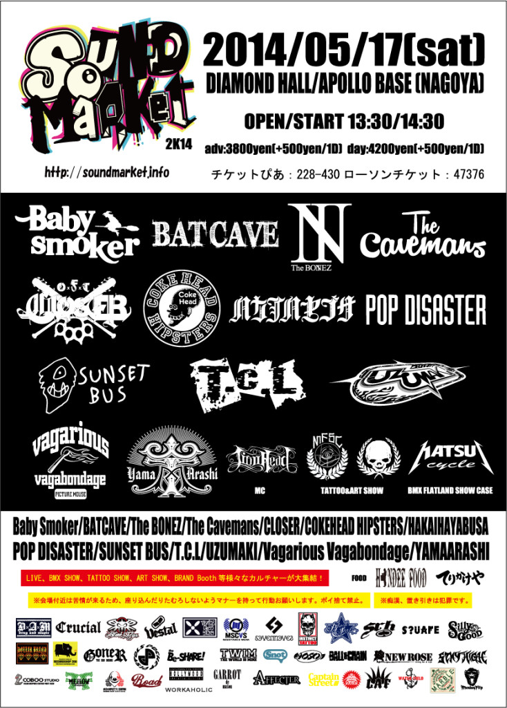 2014 5/17(sat) Sound Market 2014@DIAMOND HALL BMX flatland show case Takahiro Enoki Yasushi Tanabe Shunsuke Washii Takayuki Iwate の4名で出演させていただきます!! 会場でおまちしております!! http://soundmarket.info/ |