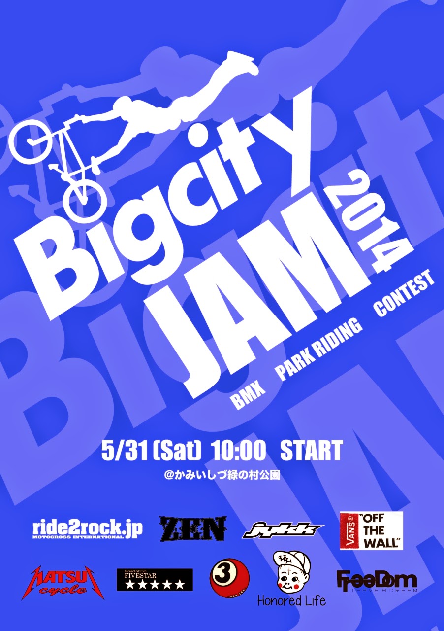 5/31 (sat) 岐阜県 上石津 緑の森公園 BMX STREET JAM CONTESTが開催されます!!是非、ご来場ください!!! 詳しくはBigCityJam HPにて★ http://sunride-bmx.blogspot.jp/ |