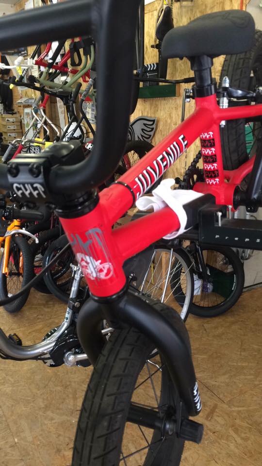 メーカー在庫切れで次回の入荷も9月とのことです!お子様の本気にも応える最高のkids BMX. 軽いアルミフレームでガンガン飛んじゃってください!! CULT JUVENILE 12inch 税込定価\61,950 小さい傷と汚れがあるのでセール価格で [[店頭販売税込価格 \54,800- ]] マツイサイクル 052-612-2681 matsuicycle@yahoo.co.jp |