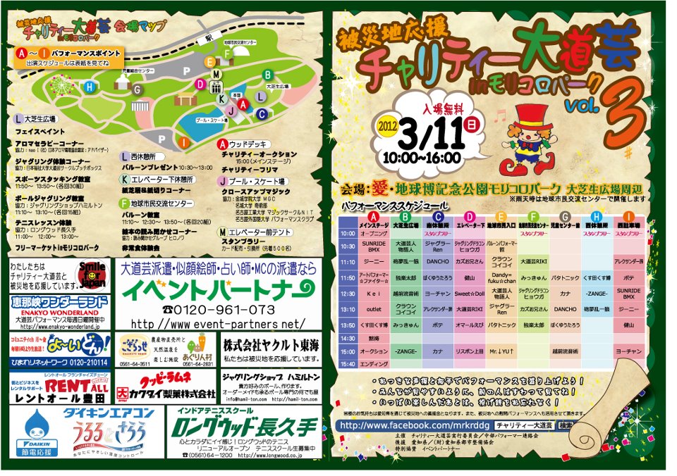| 「チャリティー大道芸」 というイベントで BMXショーを行います☆ BMXショーの時間は10:30~メインステージです!! 入場無料ですのでぜひお越し下さい!! 詳しくはイベントHPにて確認をお願いします。 https://sites.google.com/site/mrkrddg/ http://www.facebook.com/mrkrddg |