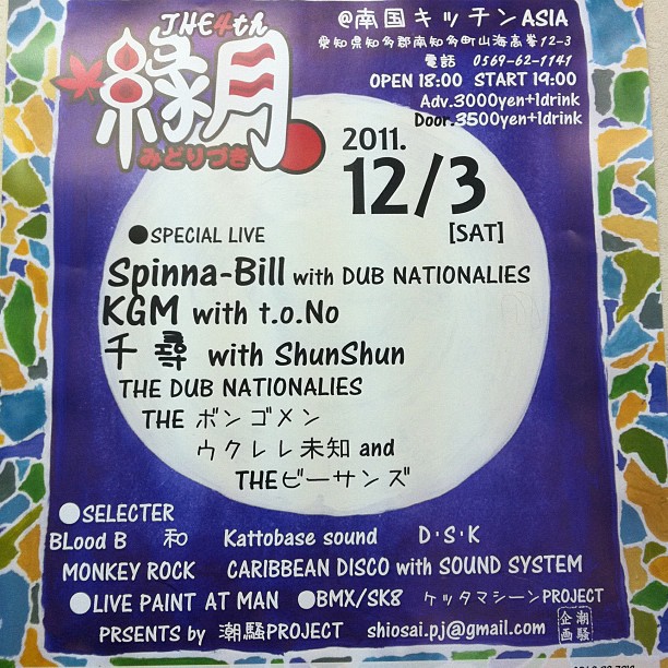 レゲエ+BMX!!イベント情報です!!知多半島は海の見える南国カフェ亜細亜で働くスタッフみんな実はBMXライダー!毎年セクションも作ってBMX&SK8も楽しめるイベントになってます是非、ご参加ください!! ★2011年 12月3日 『緑月 vol.4』 OPEN 18:00 START 19:00 ADV 3000yen(+1DRINK) ADM 3500yen(+1DRINK) ●SPECIAL LIVE● ・Spinna B-ill with DUB NATIONALIES ・KGM with t.o.NO ・千尋 with Shunshun ・THE DUB NATIONALIES ・THE ボンゴメン ・ウクレレ未知 and THE ビーサンズ ●SELECTER● ・Blood B ・和 ・Kattobase sound ・D・S・K ・Monkey Rock ・CARRIBEEAN DISCO with SOUND SYSTEM ●LIVE PAINT● ・ATMAN ●BMX&SK8● ・ケッタマシーンPROJECT たくさんのファンが待ちに待った「緑月」 1年のブランクでパワーアップして2011年に復活! ★出店もたーくさん!おなかぺこぺこで遊びに来てねー! ●ナンシーバーガー ●縁家ラーメン ●焼き肉あかしろ などなど ほか多数 みんなで楽しみましょーーー! 亜細亜BLOG http://blog.seaside-asia.com/ ※当店でチケットを取り扱いしてます※ マツイサイクル 052−612−2681 matsuicycle@yahoo.co.jp |
