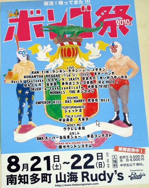 いよいよ週末ですね〜!! 現場ではMC HOOKEI(カメちゃん)が一人でミニランプセクションを組み立ててます!!僕らも今夜に手伝いに行きます! ミニランプ(ジャンプ台)の大きさは高さ1,6mX幅5,4mと巨大です!! LIVE出演メンバーも凄い!! みんなでイイ音聞いてキャンプして目の前のランプや海で泳いで BBQして★を見て寝ようぜ〜! ボンゴ祭り2010 8月21日(土) 正午より LIVE 縁とHOZU , ギターパンダ, ORdER , ぼんくら峠, NORMALS , THE ボンゴメン, 奈良大介, RAN - TIN (ランキン・タクシー with ノダチン ) SOUND 男身燻 and more... TALK LIVE 中山 康直(縄文エネルギー研究所 )『天地満開』 大泉 讃『海と核』 8月22日(日) LIVE 神麻生TRIBES, a-fank syndicate , 東海道ニコニコ楽団, 髭楽団, SKATY,せいかつサーカス, Raschi Peutanke (ラスタンケ) , ROHANTHA REGGAE ( from Sri Lanka ) SOUND RAS HARRY, EMPEROR HILL , masa PERFORMANCE ジェット達 HOST MC ウクレレ未知 PA 松井Gファイター ★お楽しみ BMX スーパー自転車&スケートボードショー(MC HOOKEI) 大人もこどもも大興奮!巨大ハーフパイプが祭に登場!! 誰でも参加OKです。スーパーライダー達のSHOWも見逃すな!! 水着コンテスト 当日、水着で祭に遊びに来た人、全員に優勝のチャンスがあります(男女各一名)。 優勝者には豪華景品プレゼント!! 入場料 前売り3,500円 当 日4,000円 中学生以下 無料。 ※注意事項 ・駐車場の数には、かなり限りがあります。できるだけ相乗りでお越しください。(駐車場代500円) ・会場周辺にテントサイトを設けています。テント、雨具等お持ちください。 ・おいしいごはんやさんがたくさんあります。マイ箸、マイ皿等をご持参ください。 ・周辺には温泉、海水浴場がいくつかあります。着替え、水着をお忘れなく! ・防虫、日除け対策はしっかりとご準備ください。 ・自然を大切に。ゴミは各自でお持ち帰りください。 ・出店、ワークショップ、ボランティアスタッフ募集中!事前にお問い合わせください。 mail@thebongomen.com ・雨天は成り行き次第です。 遊び倒れる覚悟で参加せよ! |