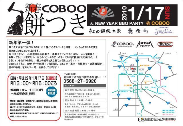 まだまだ寒さが厳しい毎日ですがいかがお過ごしでしょうか。風邪にも負けずBMX乗ってHOTになるイベント情報が入りました★いつもカスタムペイントでお世話になっているCOBOO STUDIOさんが餅つき大会を開催するとのことです、もちろんBMXセクションも出現!今回は壁にランプを付けてWALLライドJAMを開催します!気楽にご参加ください。 ◆1月17日(日)です!! 詳細はCOBOOまでどうぞ♪ http://coboo.jp/ 行きたいが、足がない!!ってライダーは17日・11時にマツイサイクル集合です!! |
