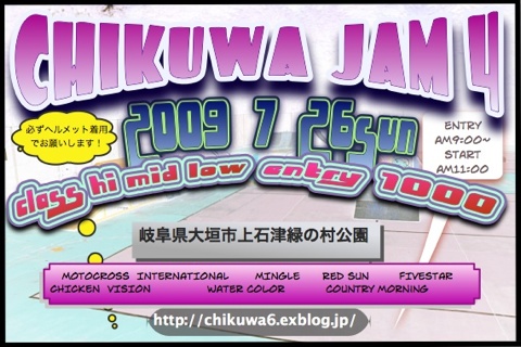 ◆CHIKUWA JAM 開催日:2009年7月26日日曜日、受付9:00〜10:30、スタート11:00〜 開催場所:大垣市かみいしづ緑の村公園 住所:岐阜県大垣市上石津町上多良前ケ瀬入会1-1 内容:クラス別ジャム、ワンエイティー(距離)&バニーホップ(高さ) クラス:HI、MID、LOW ※上位3名に商品有り エントリー費:¥1,000 ジャッジ:エントリーライダー全員 MC:カメちゃん オフィシャルブログ:http://chikuwa6.exblog.jp/ 夏だ!!BMX!!遊びに行ってみよう!! |