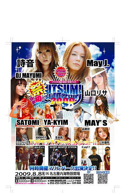 内海緑地にMINI RAMPが出現!!というか今日の夕方から搬入準備です。みんなで遊びましょう!! 会場で乗るっ!!ってライダーは正太郎にご一報願います。(090-3578-5397) ★内海サマーストーリー★ 8/08(土)愛知@内海海水浴場 AM12:00開場13:00開演〜PM8:30 <雨天決行> 入場料 前売り:3000円 当日:4000円 チケット問い合わせ・TEL:052-253-5239 WEB http://www.samasuto.com/ 携帯サイトhttp://www.samasuto.com/m/ Lコード :46429 ぴあコード:329-666 チケット問い合わせ窓口:052-253-5239 主催者 内海観光協会 UTSUMI Summer Story実行委員会 後援 名古屋テレビ/ZIP FM 協力 NPO法人あいちクローバー 企画運営 株式会社Grand2/有限会社技音サウンドテクニックス ・海外の恵まれない子供たちへの、目に見える形で物品援助 ・カルテット ・詩音 ・SATOMI ・MAYS ・DJMAYUMI ・MayJ. ・山口リサ ・YA-KYIM・ モデル:山本優希 (JERRY)森摩耶 (JERRY) 江口ちり (JERRY) 里美茜 (Happie nuts)尾崎紗代子 (Happie nuts) ・WASSE(プロサッカーパフォーマー) SHOWTALOW(BMXプロパフォーマー) &BMX ALL STARS ・「一緒に一食を」計画 来場者が一食を会場で食べると一食をケニアの子供たちに支援されます。 ・NPO法人との連携による社会貢献 ・ボランティア活動により地元に親しまれてきた内海海水浴場のクリーン運動 ・AEDの普及と認知度の上昇 2008年度に開催された、第一回UTSUMI Summer Storyは3000人の来客により、たくさんの笑顔で大反響となりました。 サマストでは、来場者の皆様を普段では体験のできない夢のような世界へご招待いたします。 その為に、音楽、自然、海、光、フード、ドリンクやお祭りを超えた、会場づくりにこだわっています。 皆様の、一年に一回の夏物語となる事を願っています。 夏しましょう♪ |